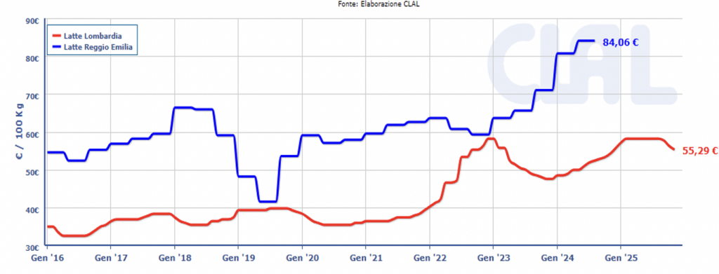 Oggi mentre nell’area Lombarda i “costi di produzione” sono molto vicini alla remunerazione media del latte, nell’area del Parmigiano Reggiano i due valori hanno ricominciato a differenziarsi in modo significativo.